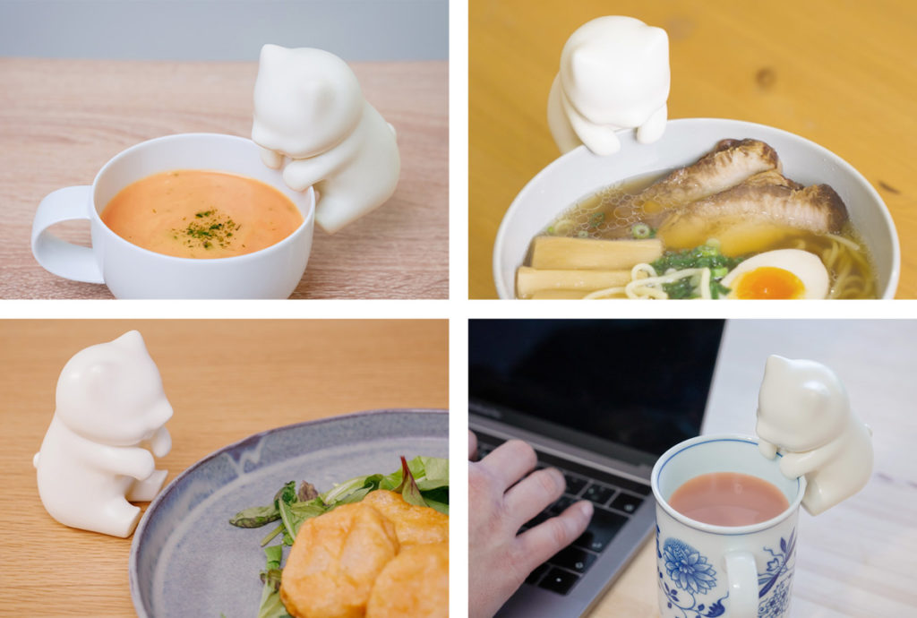 丸みをおびたフォルム、猫を思わせる耳、そして猫と人の中間の形状を目指した独特な口元といった特徴にこだわりながら、カップにしがみついて一生懸命ふーふーする姿を思わず応援したくなるようなデザインに仕上げました。本体カラーは、「ミルク」「さくら」「チョコ」の3種類を用意しています。