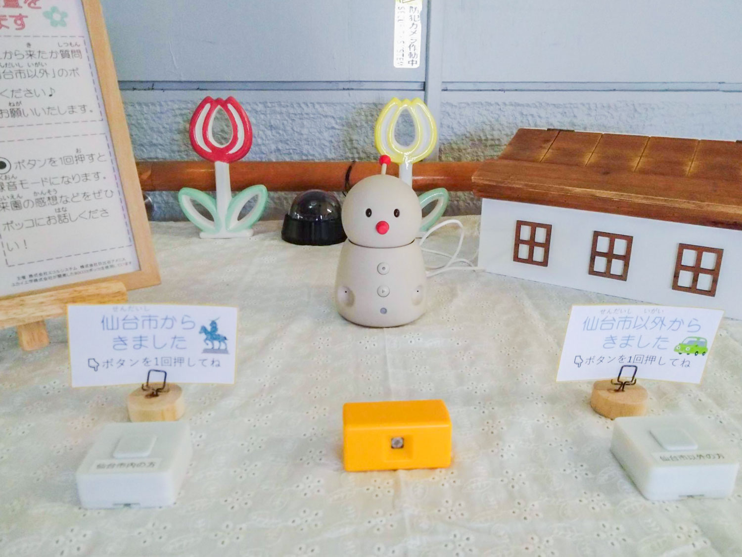 園内の休憩スペースに展示しているBOCCO emoに近づくと、どこから来たか質問を音声で投げかけます。来場者は「仙台市からきました」、「仙台市以外からきました」のどちらかをボタンで回答します。またBOCCO emo本体の録音ボタンを押して、声でアンケート回答することも可能です。これまでの紙のアンケートでは取れなかった親子連れや若年層のデータを取れるようになり、回答率がこれまでの10倍に改善されました。