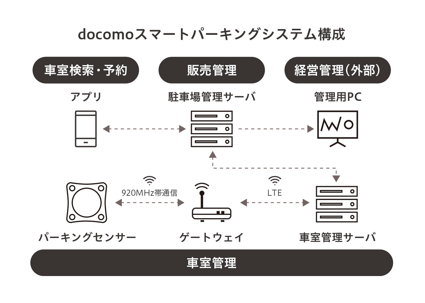株式会社NTTドコモの提供する「スマートパーキングシステム」は、車の入出庫を感知する機能を搭載したIoT機器「スマートパーキングセンサー」、通信モジュールを搭載したゲートウェイ、及びクラウド上の駐車場管理サーバーから構成されるシステムです。