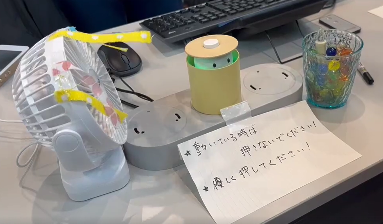 ユカイ工学さんから複数のデザインパターンを提案いただき、ボタンの付いた何かが筒の中に隠れていて、スイッチを押して欲しそうにもじもじしている案に決まりました。このロボットは筒の中から「暑いなあ」と言いながら少し見え隠れします。ロボットの頭上にあるスイッチを押すと扇風機に連動し、操作に対してロボットがお礼を言ってくれる仕組みになっています。