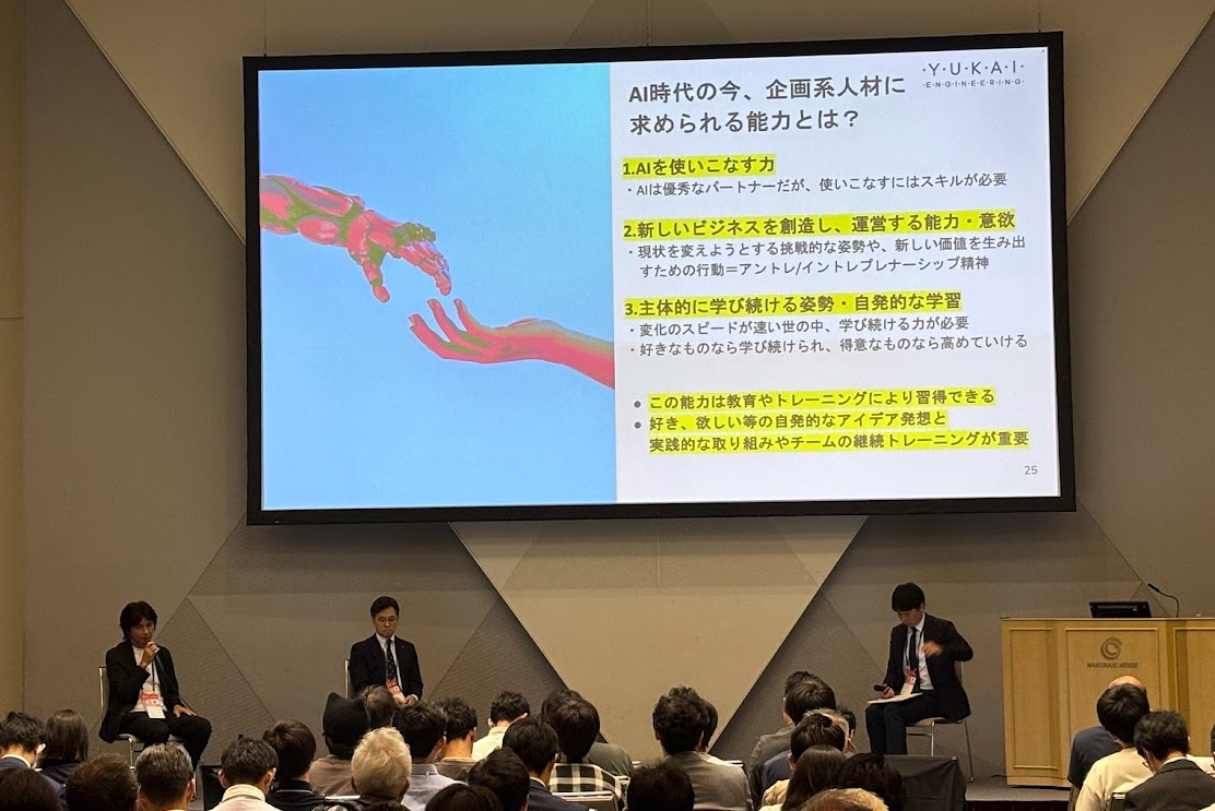 先ほどユカイさんの妄想会の話にもありましたが、これらはトレーニングで身につけられるというのが前提と考えています。少子化の時代ですが、こうしたトレーニングを教えるような新しい学校も増えてきていて。例えば先進的な教育機関では、アントレプレナーシップ(現状を変えようとする挑戦的な姿勢や、新しい価値を生み出すための行動)×AIをテーマに、課題解決をチームで繰り返すことで精度を上げていくというプロジェクト型学習を行っています。インプットやマーケティングという部分ではAIが優れた能力を発揮できるので、それをふまえて学習の仕方や考え方を変えることが大事ですね。