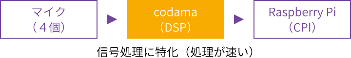 4つのマイクの音をDSP(digital signal processor)が処理をして、その結果をRaspberry piに送っています。その結果、Raspberry piにとって音声認識は軽い処理になります。